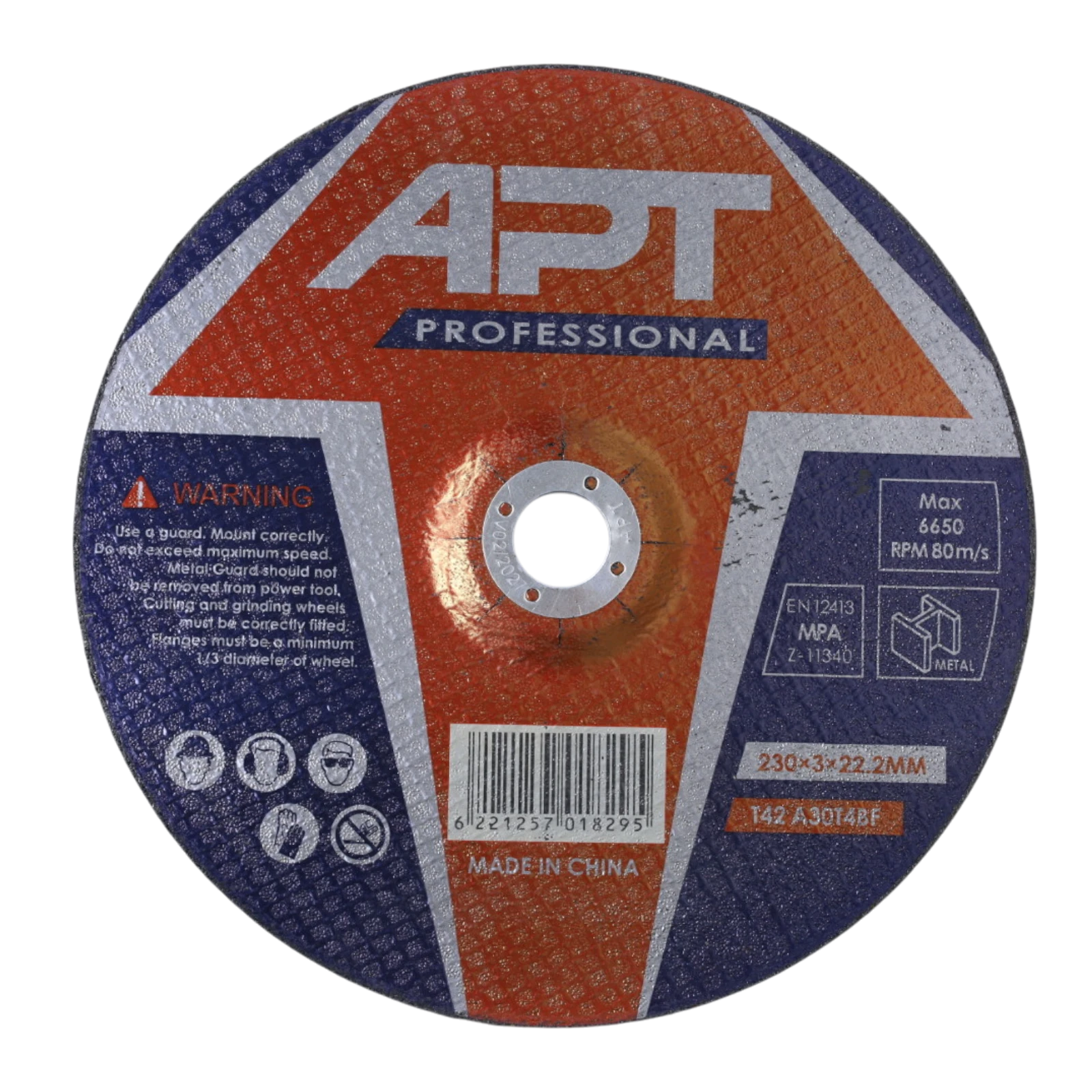 حجر قطعية مقاس 9 بوصة بسُمك 3 ملم من APT، مخصص لقطع الحديد والمعادن بسرعة ودقة. يقدم أداءً مستقراً مع السماكة المناسبة التي تساعد على تحقيق قطع نظيف وتقليل المقاومة أثناء الاستخدام.
