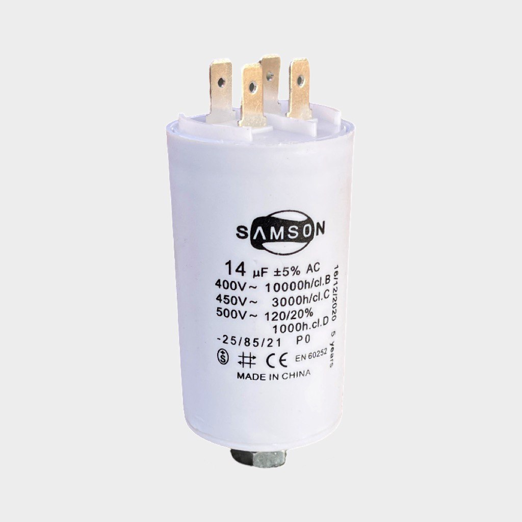 مكثف تشغيل كهربائي بسعة 14 ميكروفاراد من نوع ترمل (CBB60/CBB65)، مصمم لتحسين أداء المحركات الصغيرة والمتوسطة.